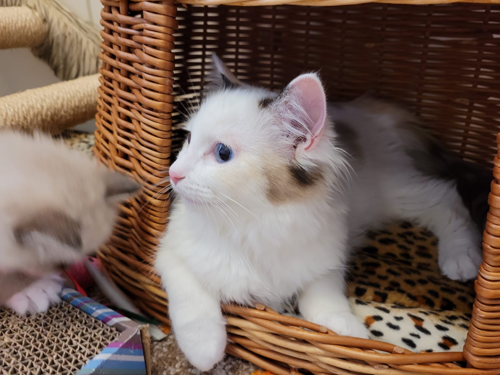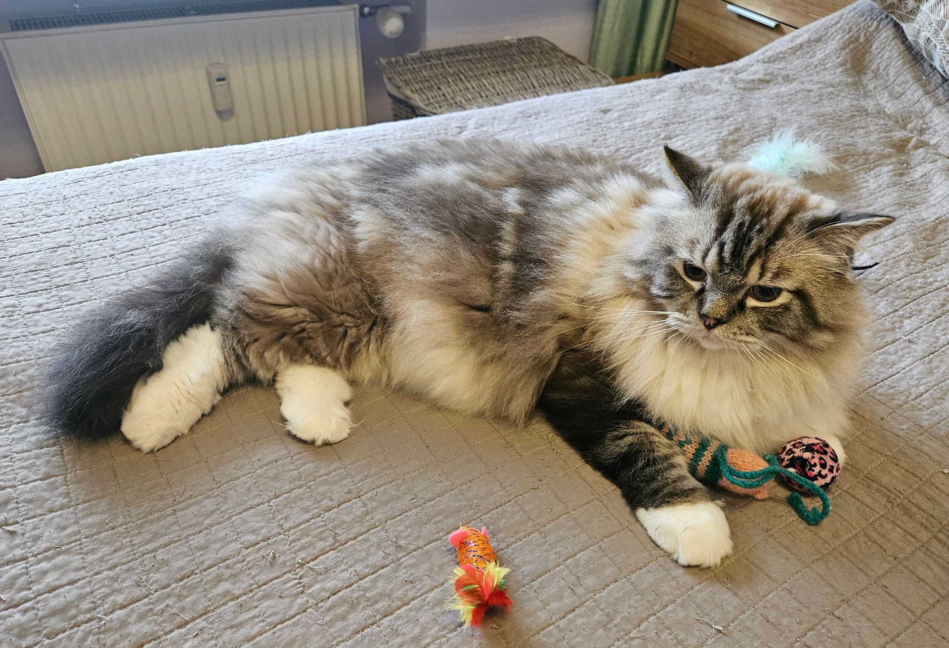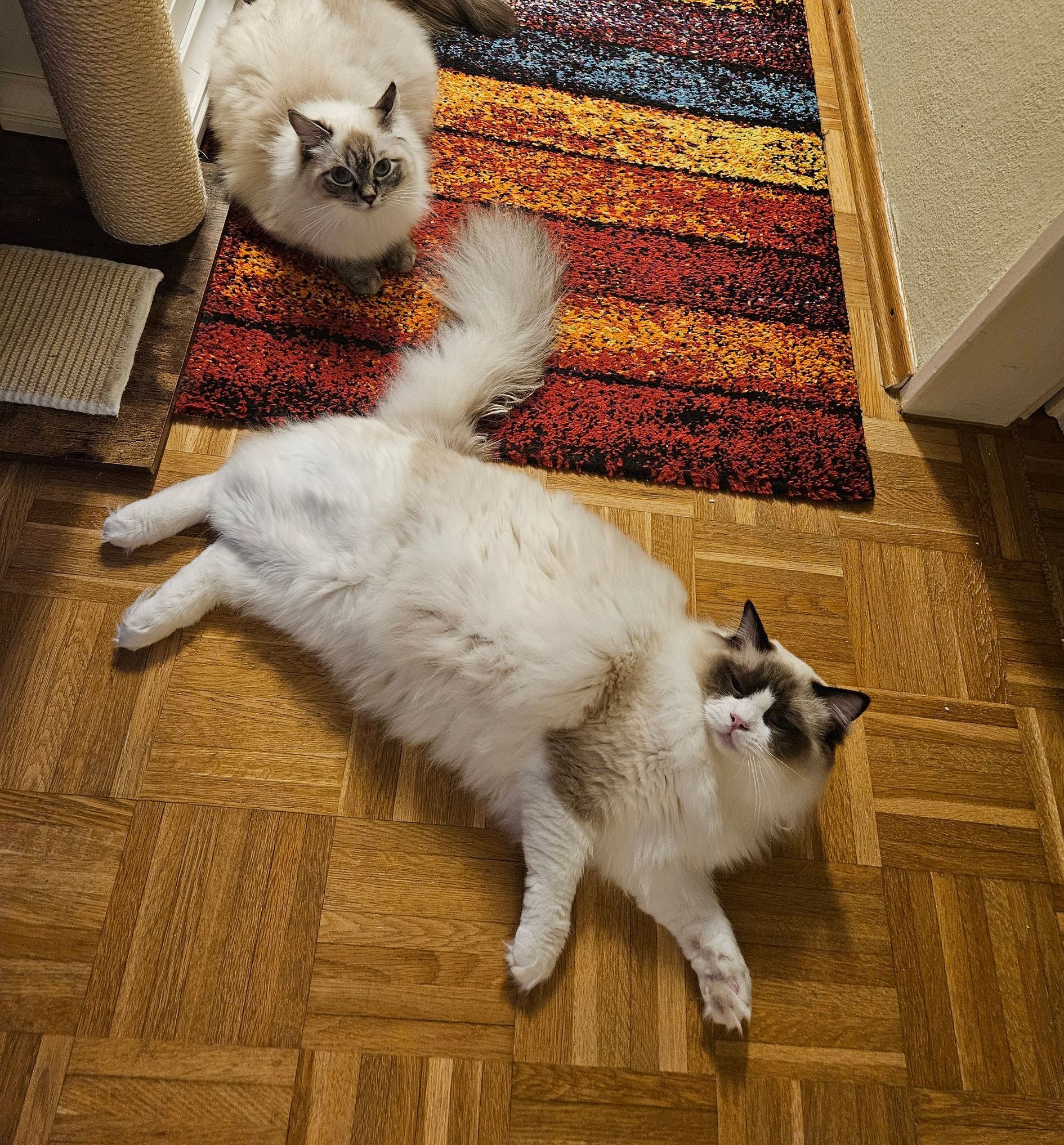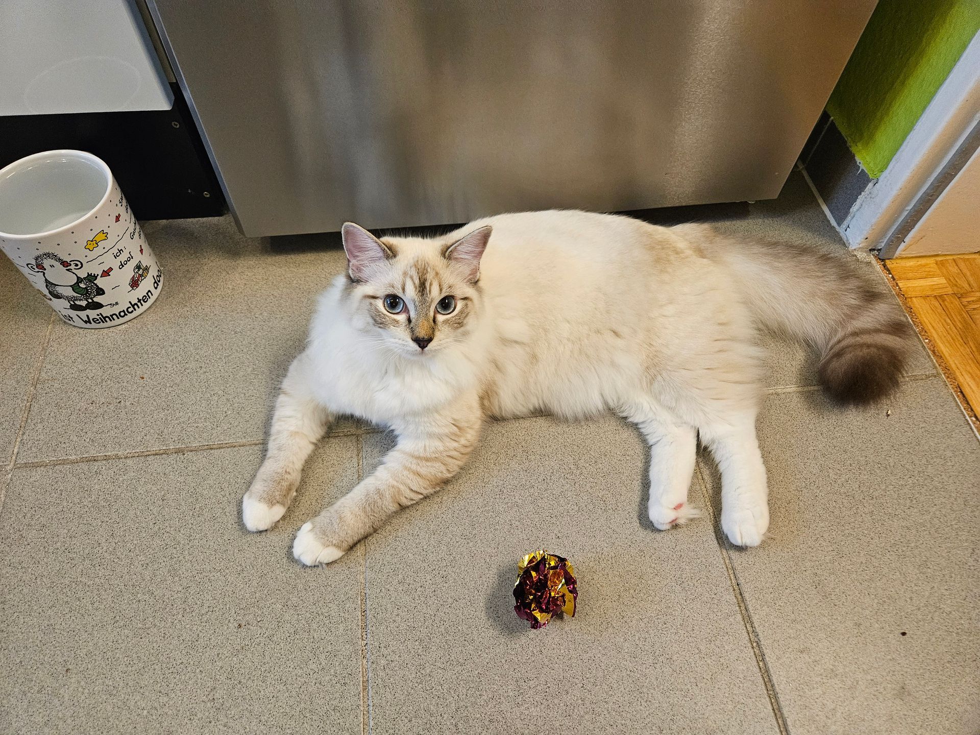Das Fell der Ragdoll wirkt pflegeaufwendiger, als es in Wirklichkeit ist. Es verfilzt kaum und bildet selten Knötchen. Gelegentliches Bürsten reicht in der Regel, um den seidigen Pelz gepflegt zu halten. Während des Fellwechsels ist tägliches Bürsten ratsam, um die losen Haare zu entfernen. Ragdolls tendieren dazu, Fett am Unterbauch anzusetzen. Daher sollten Sie bei erwachsenen Katzen regelmäßig das Gewicht kontrollieren. Jungtiere mit schnellen Wachstumsschüben können zeitweise einen erhöhten Nahrungsbedarf haben. Bitte achten Sie bei Ausstattung, Kratzbaum und Liegeplätzen für Ihre "Riesenkatze" auf besondere Stabilität und passende Dimensionen.